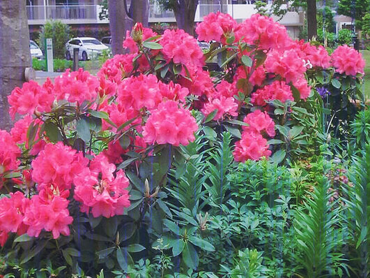 - 寄付された花苗にはそれぞれ住民の物語があるが、花壇に移植されると寄せ植えとなり、造形美という観点では見劣りする。それでも、ケヤキの大木の傍らにはカサブランカ、山百合が加わり想定外の美しさである。