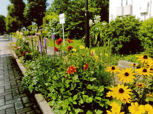 - 小平団地の共同花壇は花壇全体で20ヵ所と多数ある。しかも花壇の形態は奥行きが狭く横長の特殊な花壇である。(巾、約1m×横約12m)その為、花壇は住民全員管理形式でなく、花壇を分割して個人が管理する分担形式の方法を採っている。この活動のポイントは個人が花壇を自由に管理して楽しむことが出来る。そして個人の個性が花壇に表れることで、共同花壇全体が多様性を楽しめる空間として住民に受け入れられている。今後は花壇の特殊性を生かした花壇写真作品の発信が課題である。