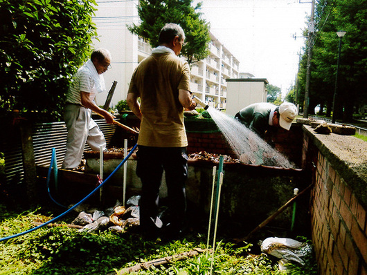 - 団地の一角を利用して落ち葉集積所を作りそこで腐葉土を作っている。これに市の生ゴミから出来る堆肥を混ぜている。この堆肥は植裁時に事前に整備された苗床へ十分入れることで土壌改良に役立てている。