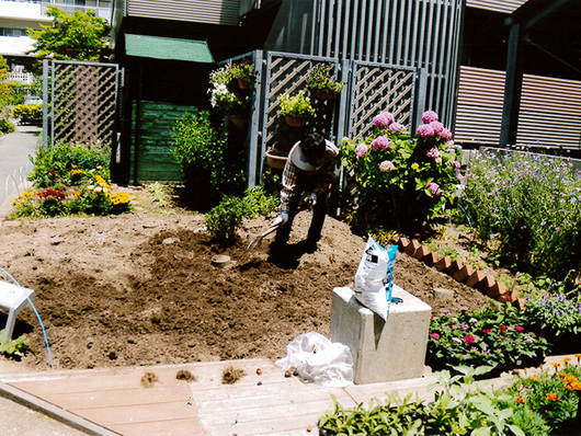- 土作りは団地の中程のどんぐり山の落葉を利用して、腐葉土を作り、花の植え替え時に全体を掘りおこし、新しい土の入れかえに利用している。