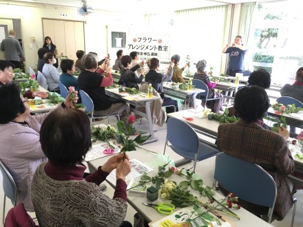フラワーアレンジメント教室では、先生の丁寧な手順説明を受けながら、参加者の皆さんが自由にお花を生けていきました。23名の方にご参加いただき、和気あいあいとした雰囲気の中、皆さん満足いくアレンジができるまで、先生やお隣の方にアドバイスを求めたり、意見を言い合ったりしていました。アレンジが完成すると、皆さんご自分で作られたアレンジメントを「おうちのどこに飾ろうかしら」と嬉しそうに持ち帰っていました。
