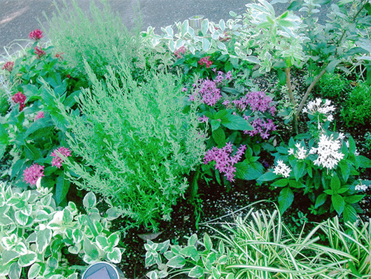 ハーブや常緑葉の中のペンタクロスの赤やピンクがかわいいです。
