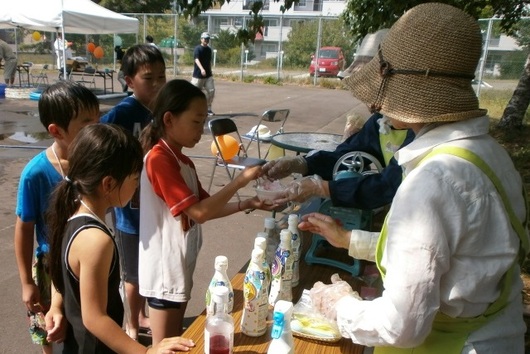 このイベントは、夏休みの子ども向けイベントとして、団地内の子育てサークルの方にご協力いただき、夏ならではの「打ち水」をメインとして北海道住まいセンターが企画したものです。イベントでは、打ち水の他にも、すいか割やかき氷の提供などが行われました。