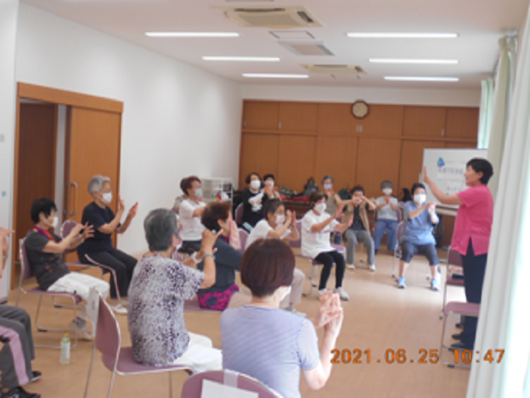 この転倒予防体操は、音楽に合わせてストレッチや筋トレを行い、転倒予防につながる運動とシナプソロジー※を行います。継続して行うことで効果が出てくるため、この体操はサークルとして継続的に活動をする予定です。参加されたほとんどの方がサークル活動に参加したいとのことで、健康に対する意識の高い方々に多く参加いただけました。