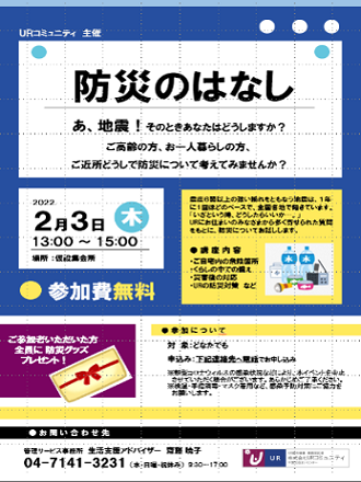 2月3日(木曜)に、千葉県柏市のコンフォール柏豊四季台団地、豊四季台第二団地、豊四季台団地で「防災のはなしイベント」を開催しました!