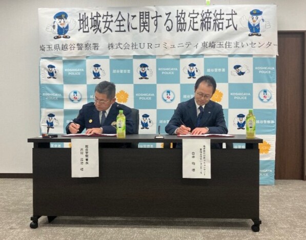 旧庁舎の老朽化に伴い、建替え工事が完了したばかりの越谷警察署の新庁舎で執り行われた協定締結式には、東埼玉住まいセンター長が出席し、地域の防犯活動に積極的に取り組んでいくことを約束しました。