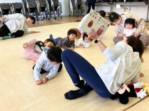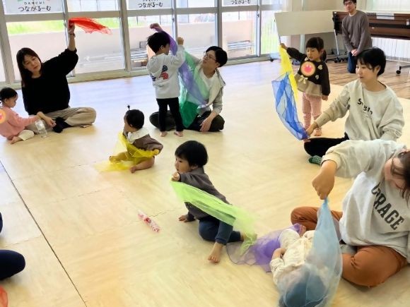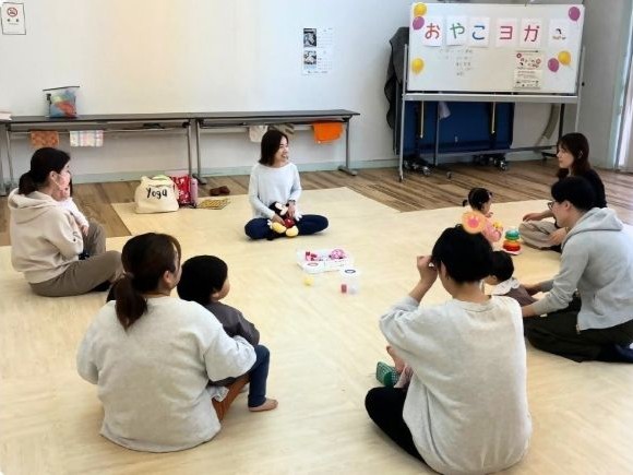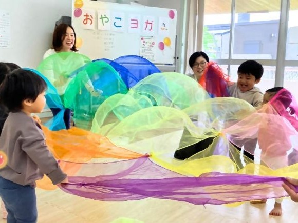 はじめてのヨガにお子さんも保護者の方も最初は緊張気味でしたが、ご自分で選んだ布でストレッチをするうちにからだも心もほぐれていきました。親子で一緒にヨガをしたり、お子さんがおもちゃや絵本で楽しんでいる間に保護者の方がヨガやストレッチをしたりと、親子でふれあい、笑顔があふれる時間になりました。