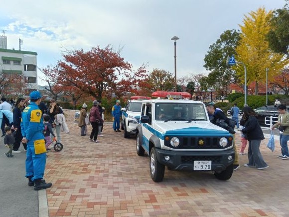 会場となった多聞台中央公園には、多聞だんだんの和太鼓や警察音楽隊による演奏、兵庫県警察の学生ボランティア「ブルーフェニックス隊」による劇やクイズなどのプログラム、多聞台朝市で出店されている飲食やくじ引きのブースなど、盛りだくさんの内容が並びました。展示された災害時に活用する車両2台は乗車も可能で、お子さんに大人気でした。